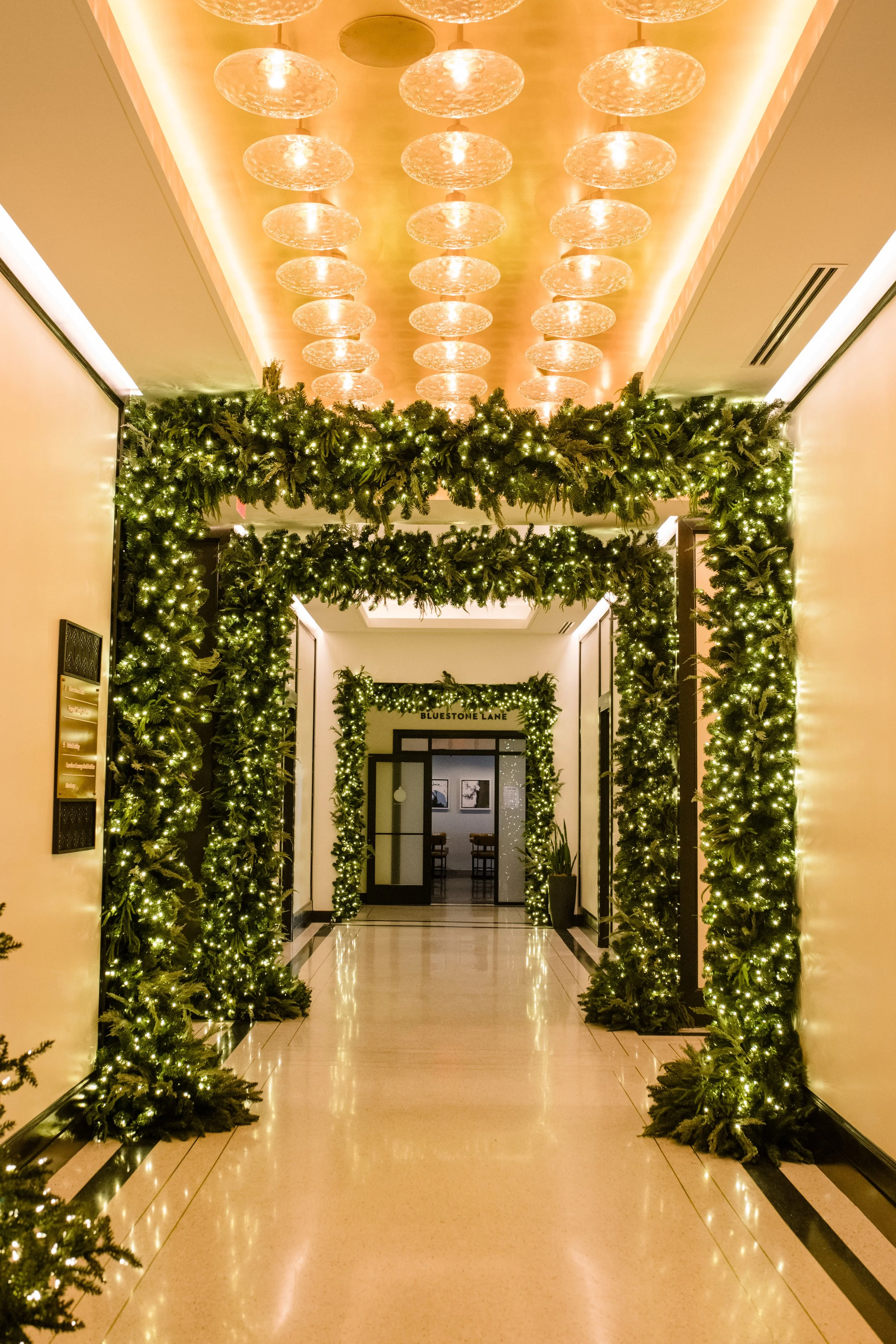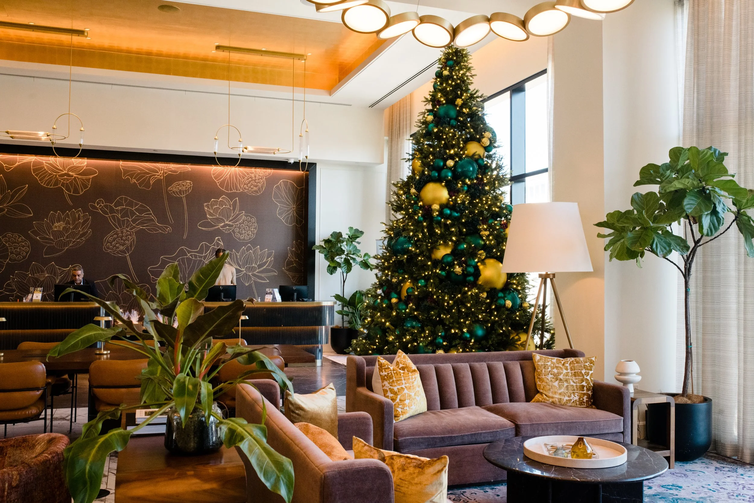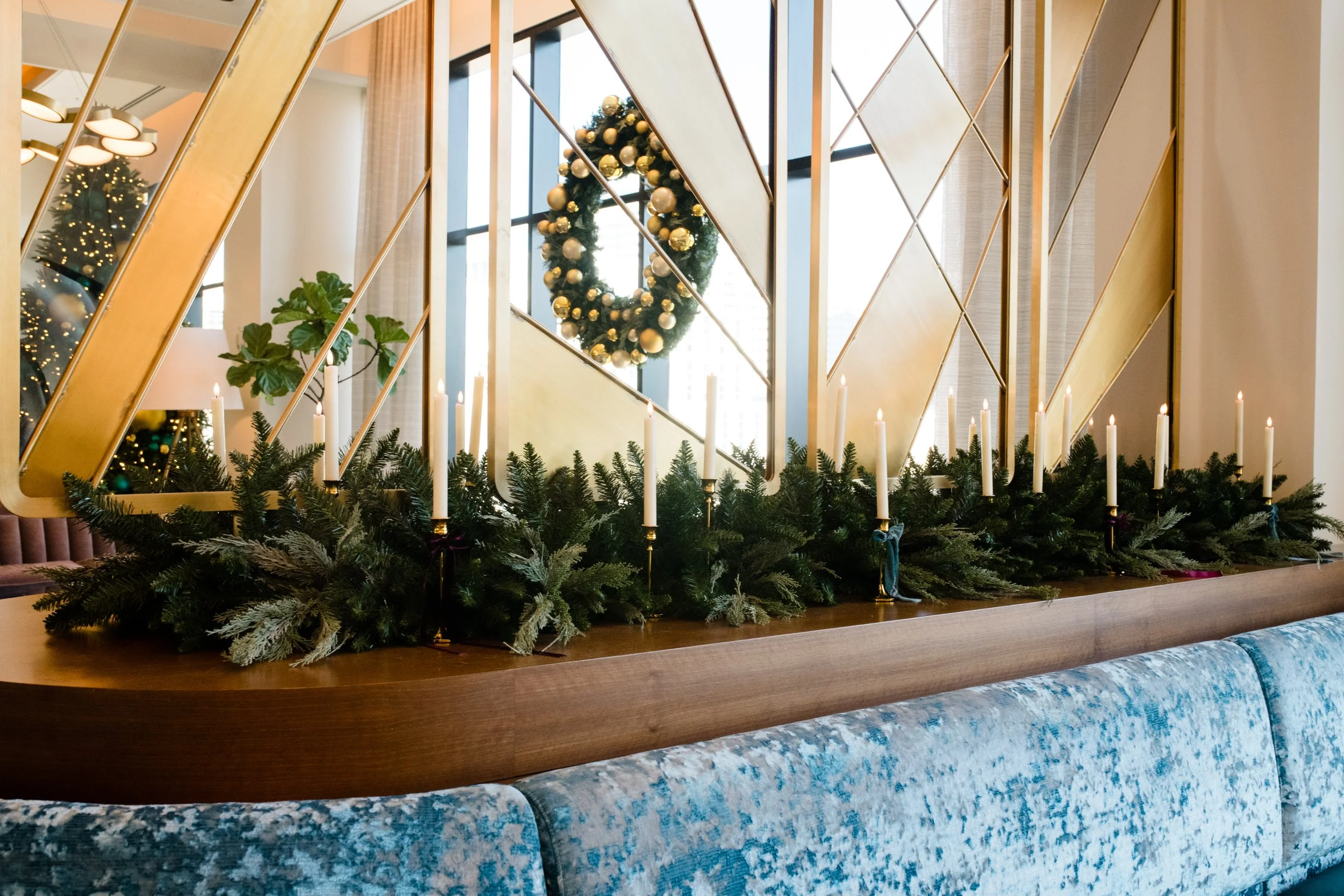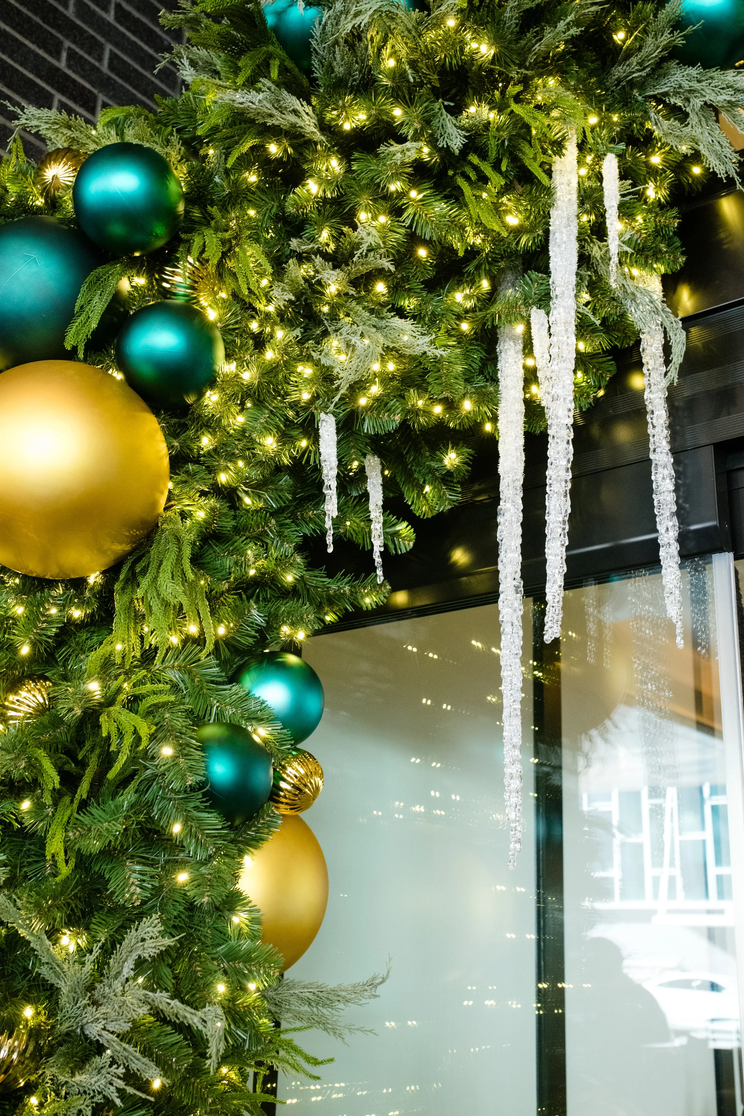 The result was Mary Louise’s Holiday Soirée, a stunning installation that transformed the hotel into a festive yet refined wonderland. The centerpiece of the design was a towering 14-foot tree, adorned with intricate bauble ornaments that shimmered in the hotel’s brand colors, creating a cohesive and glamorous focal point. Guests were greeted by a breathtaking entryway featuring garland archways dripping with ornate icicles and ornaments, setting the tone for the experience.