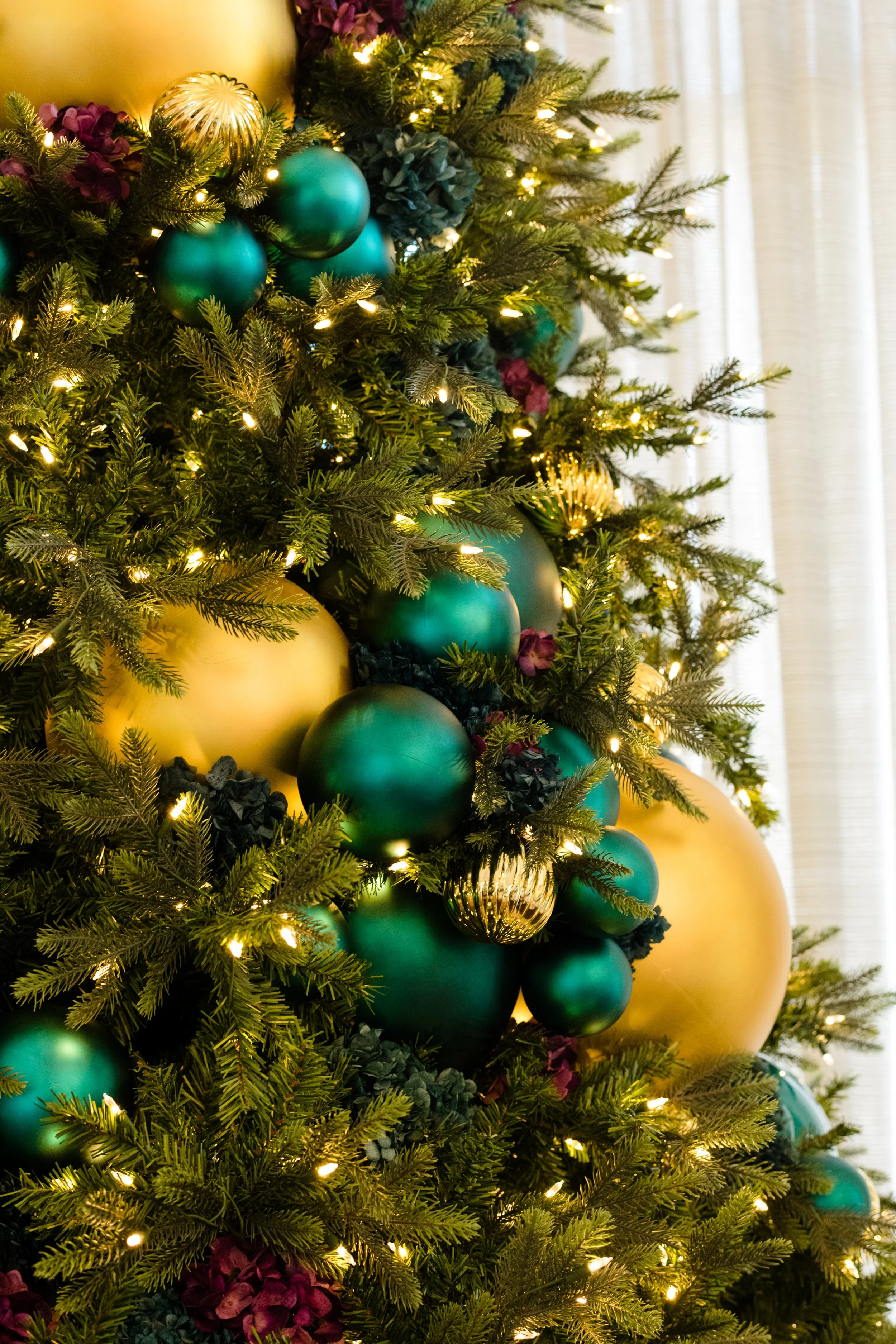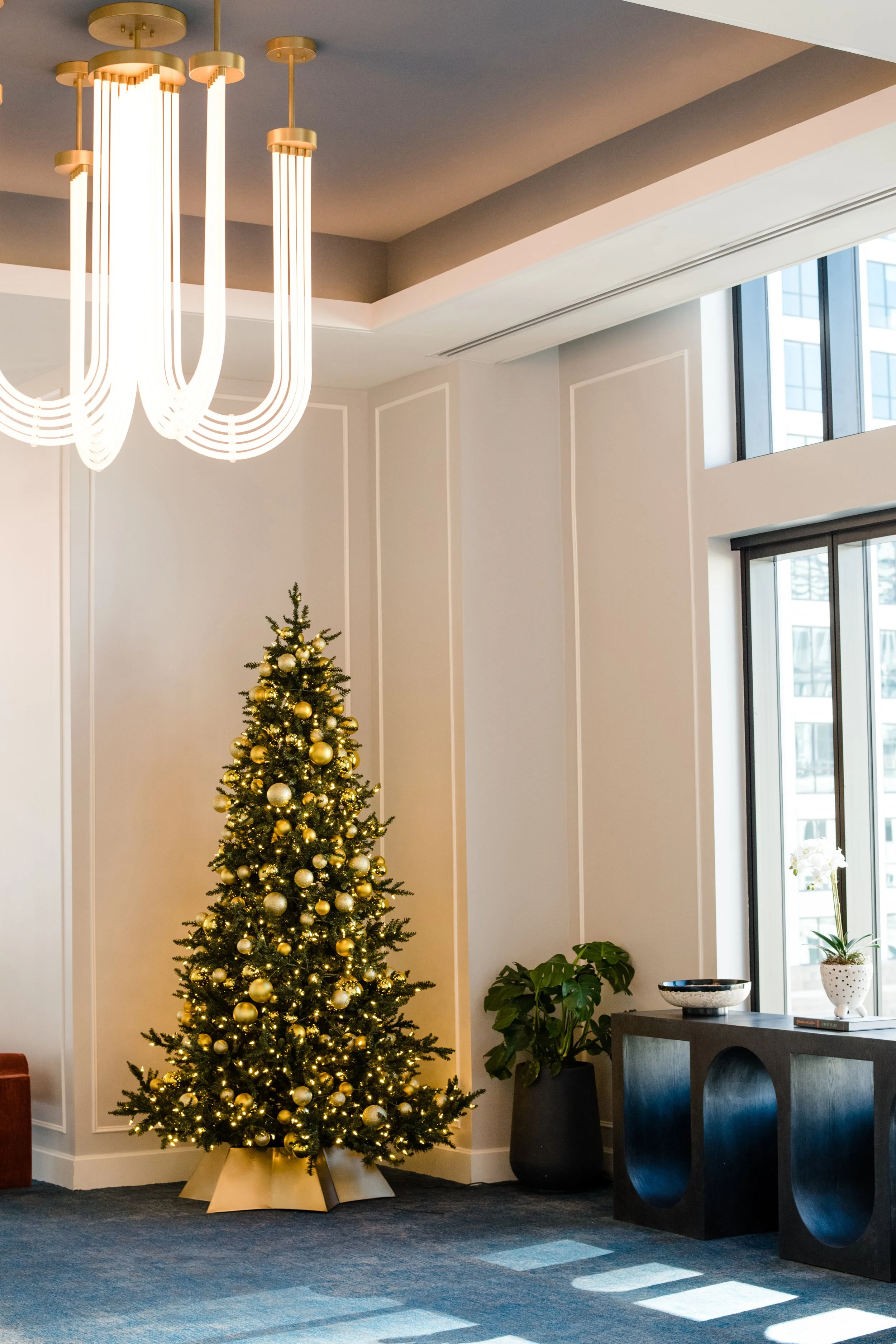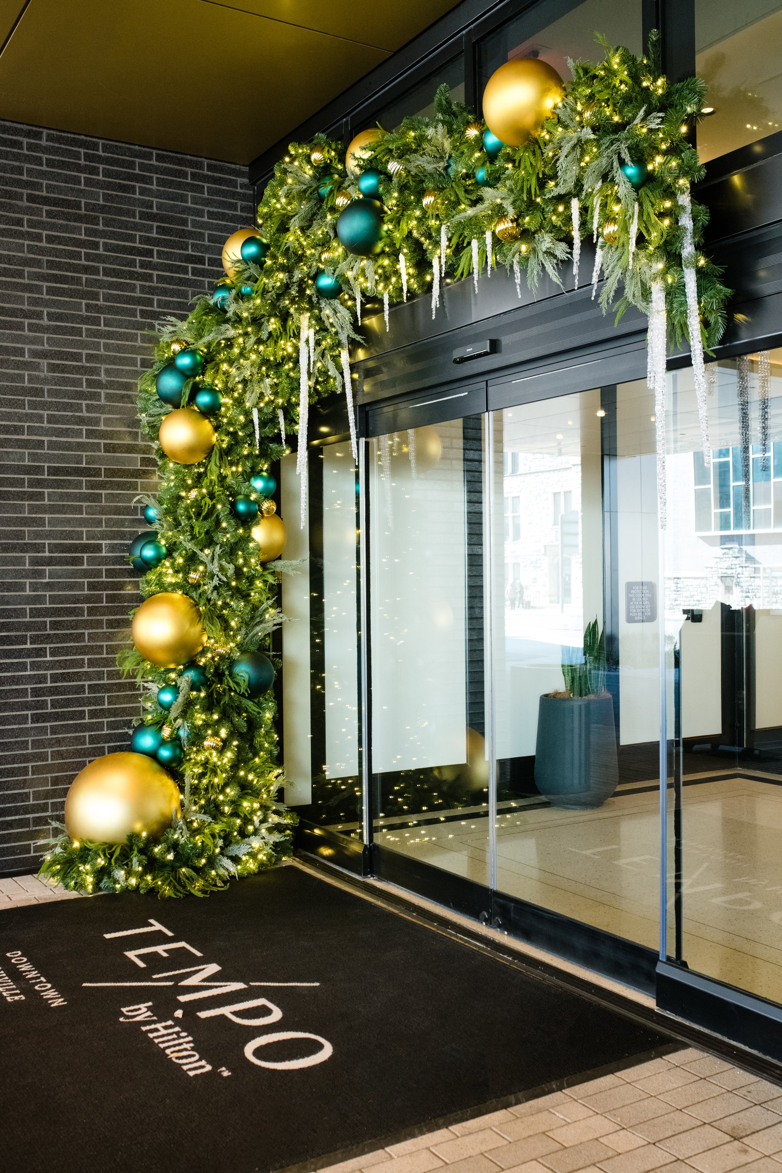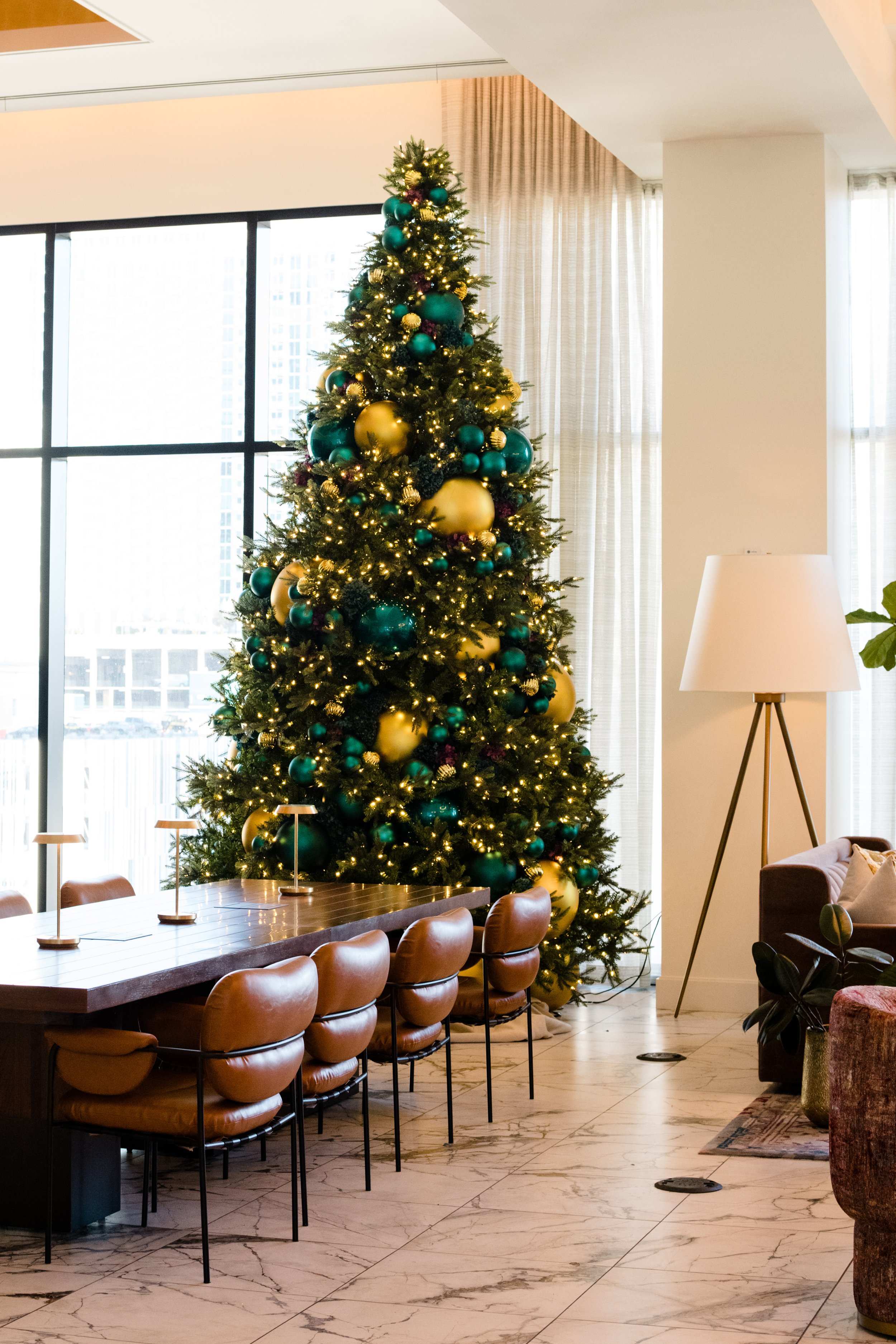 The result was Mary Louise’s Holiday Soirée, a stunning installation that transformed the hotel into a festive yet refined wonderland. The centerpiece of the design was a towering 14-foot tree, adorned with intricate bauble ornaments that shimmered in the hotel’s brand colors, creating a cohesive and glamorous focal point. Guests were greeted by a breathtaking entryway featuring garland archways dripping with ornate icicles and ornaments, setting the tone for the experience.