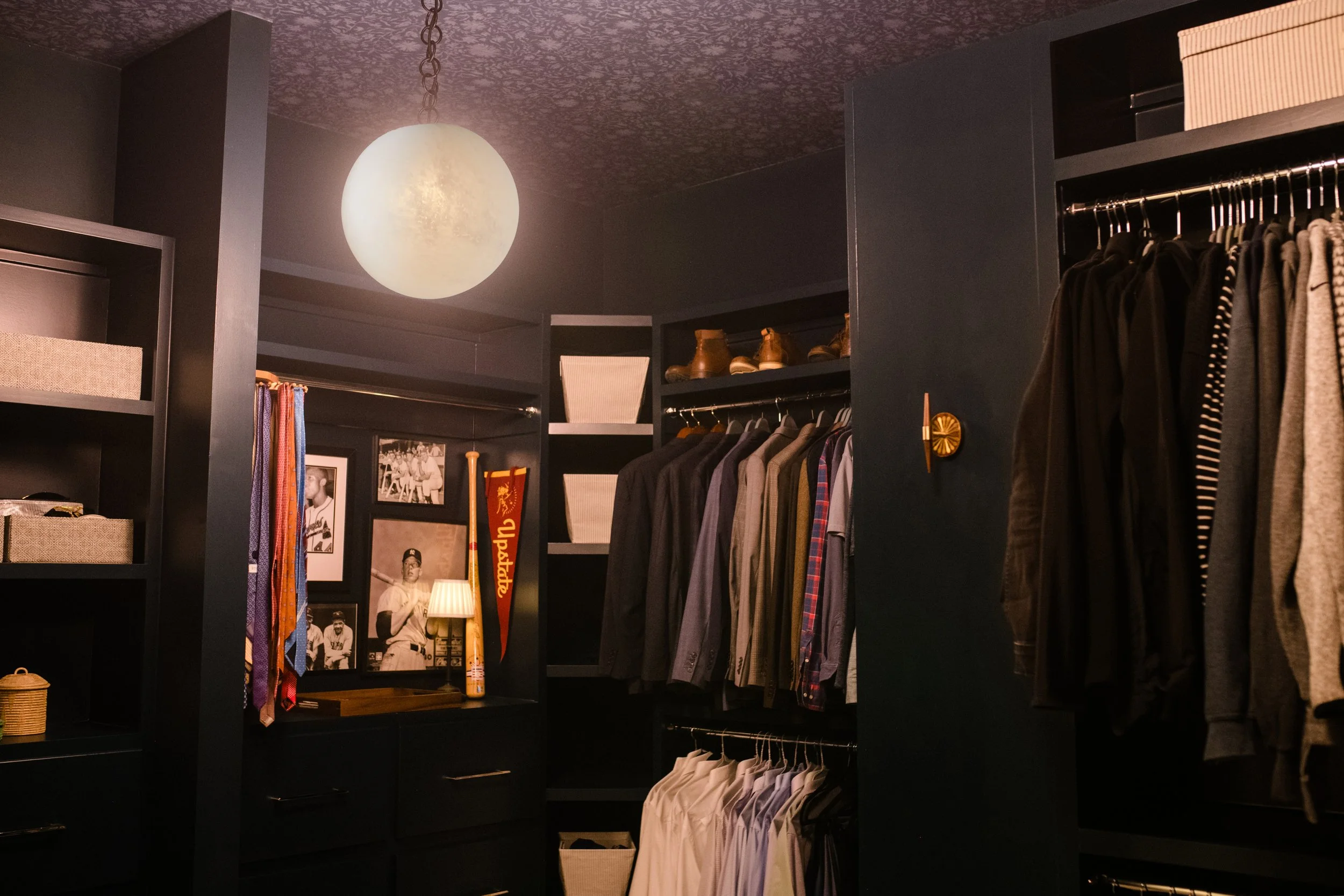 The husband’s section featured his treasured baseball memorabilia, positioned near his valet and watch collection for a personalized touch. Meanwhile, soft pendant lighting replaced utilitarian can lights, creating a serene glow and an elevated atmosphere.