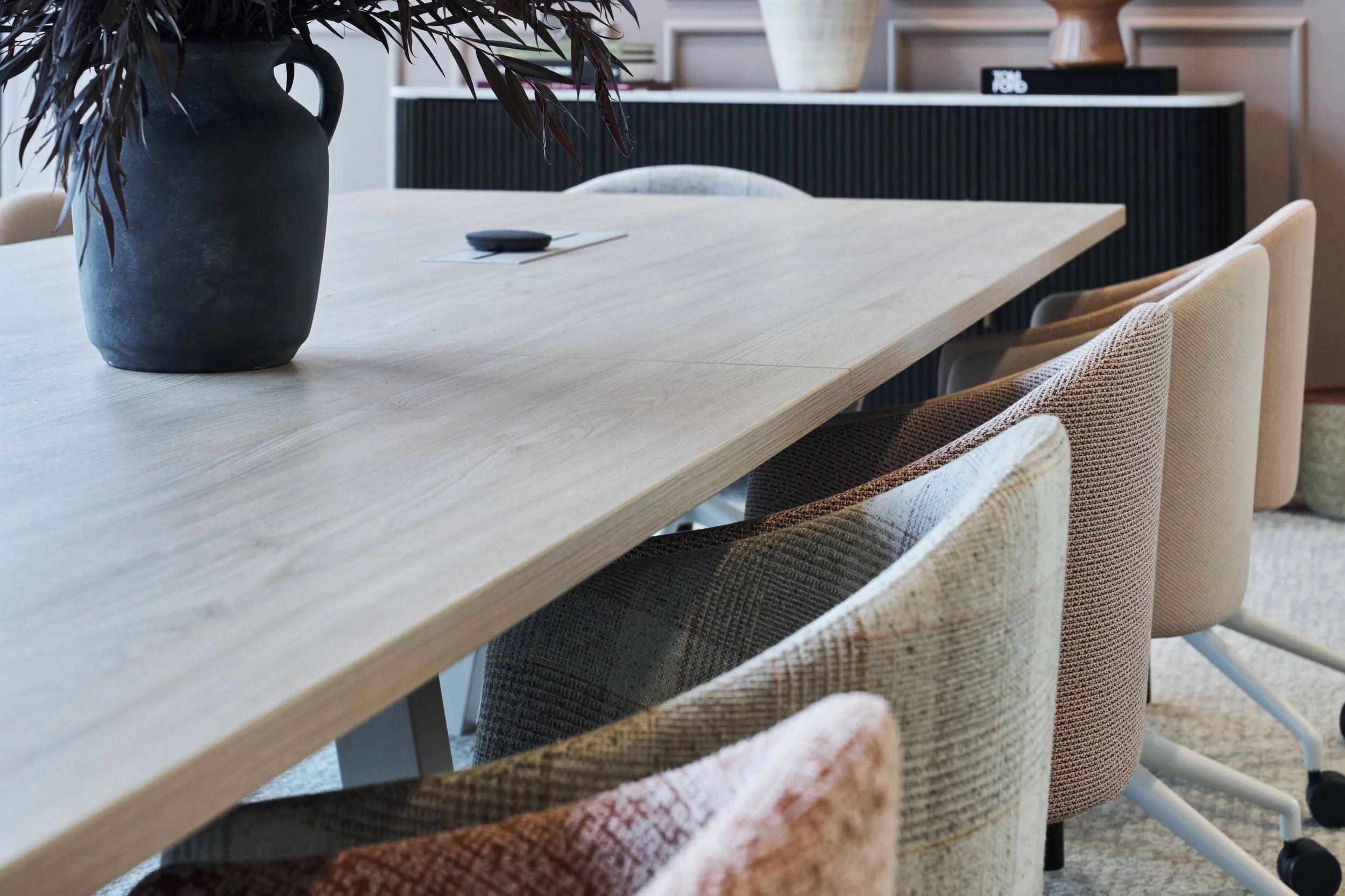 Earthy tones paired with the existing blush hues added depth and warmth, while the kitchen shelving was styled with books, florals, and ceramics to add charm and personality. Textural artworks were chosen for the walls, bringing in subtle sophistication and tactile intrigue. By layering organic elements with the space’s contemporary furniture, we achieved a harmonious balance between industrial chic and cozy refinement, perfectly suited for a creative, modern workplace.